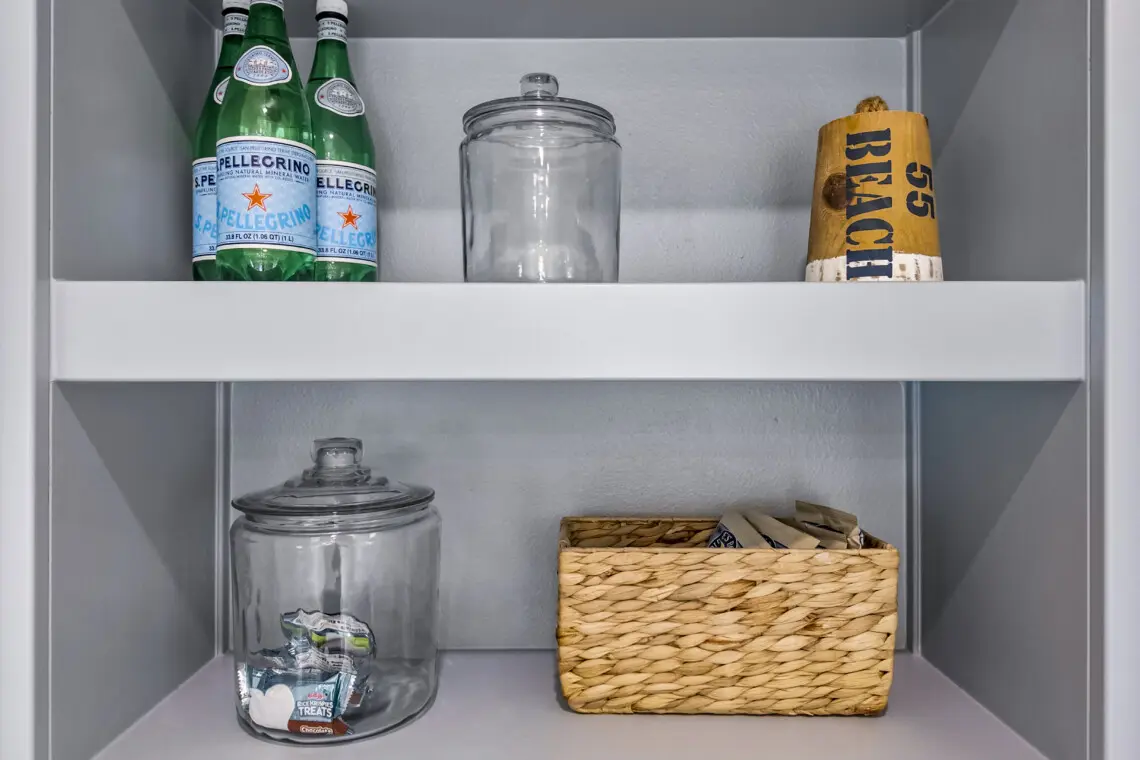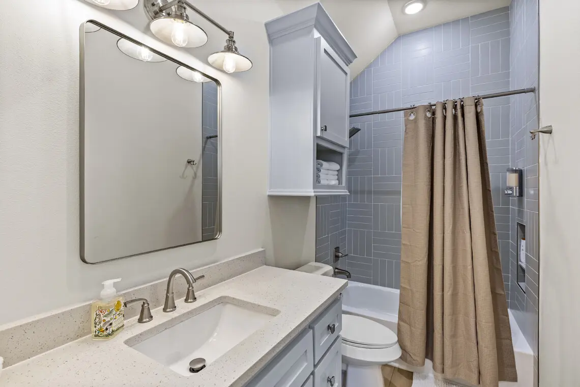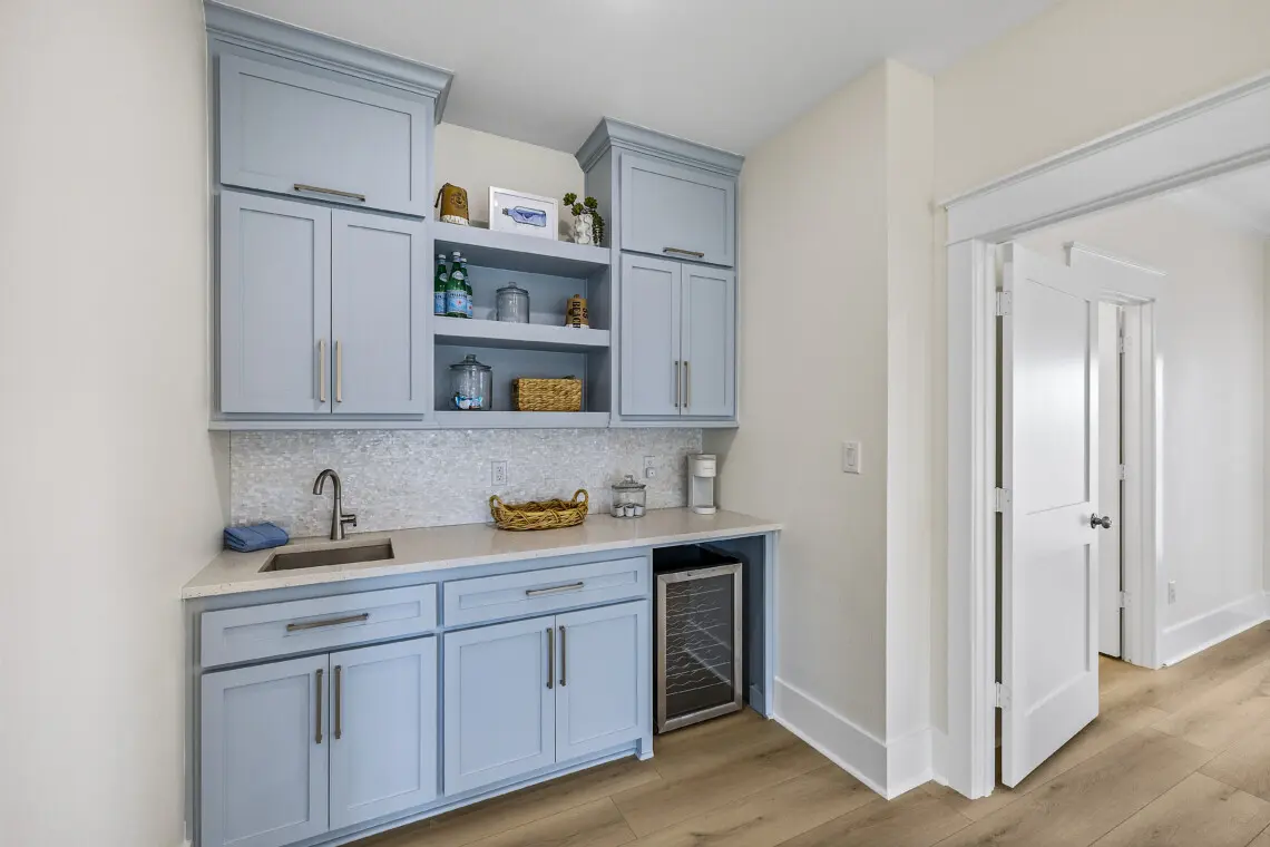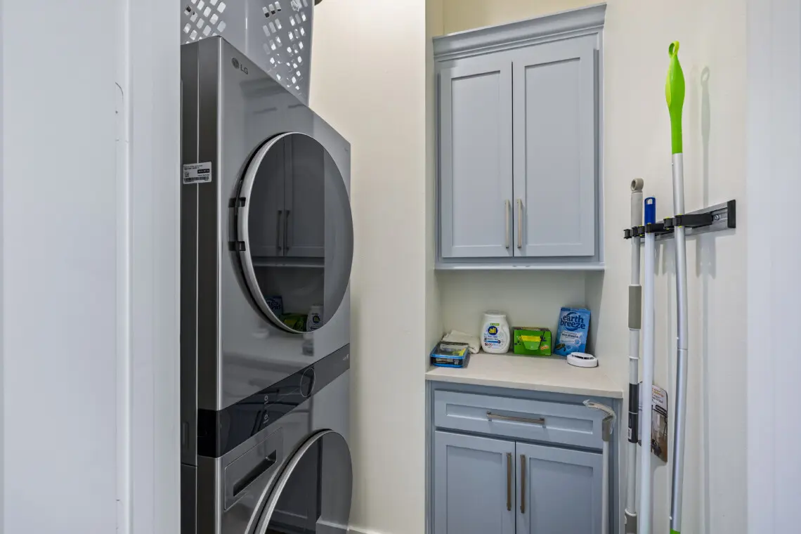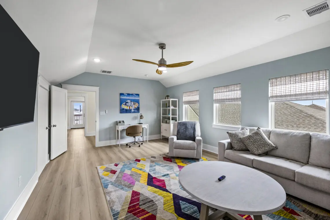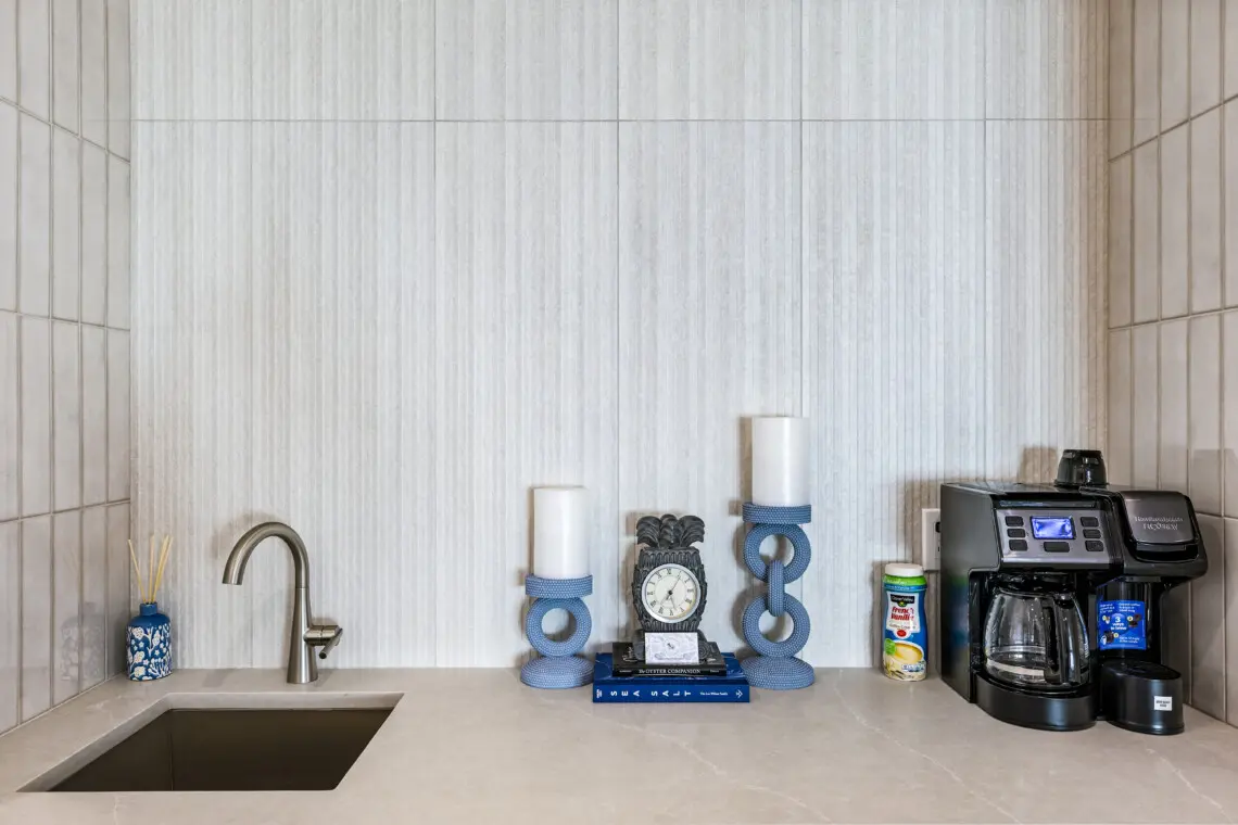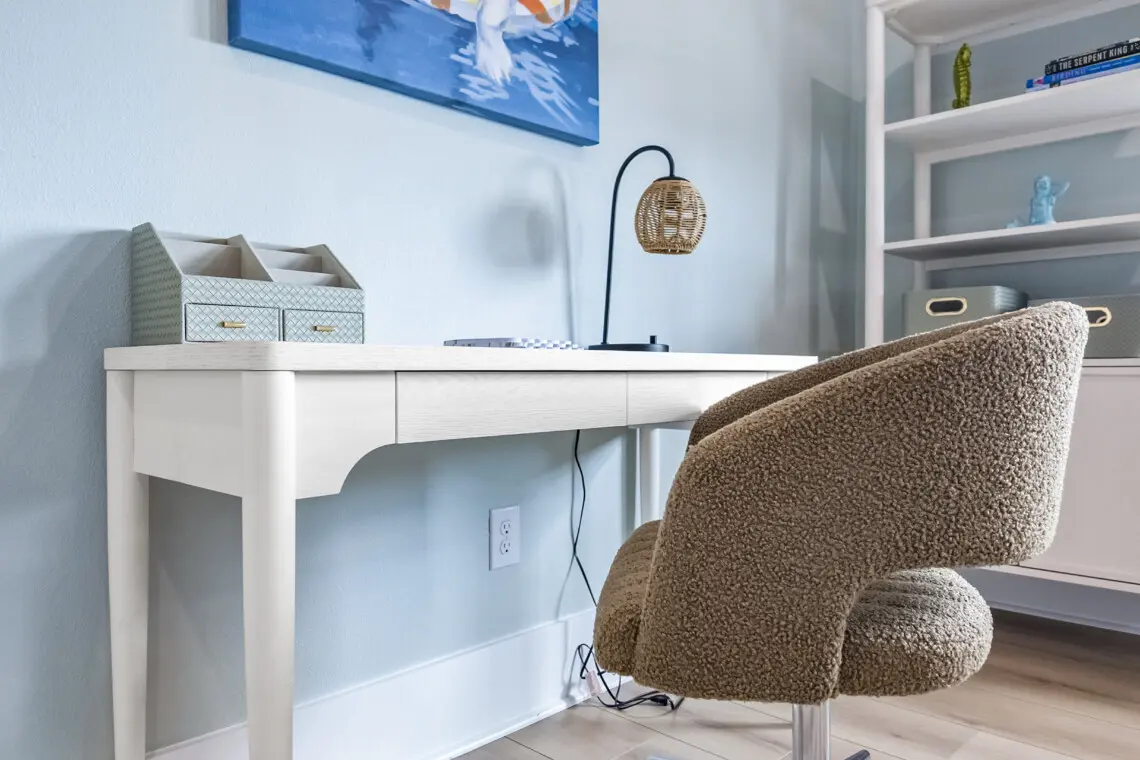 Upstairs, you’ll find a second living room, a dedicated workspace (desk + chair), and a coffee bar area with a mini fridge located between the upstairs living room and the upstairs primary suite, perfect for keeping drinks cold and mornings simple.