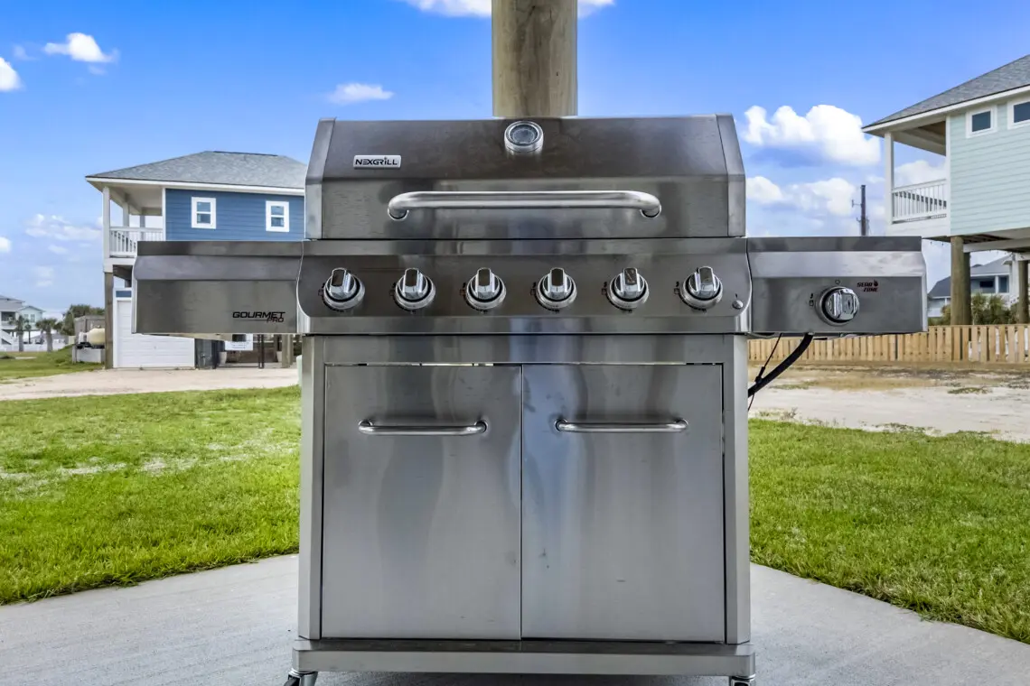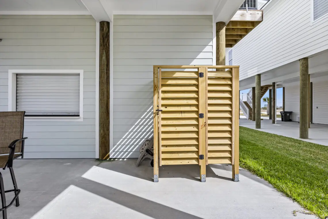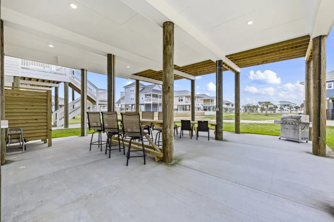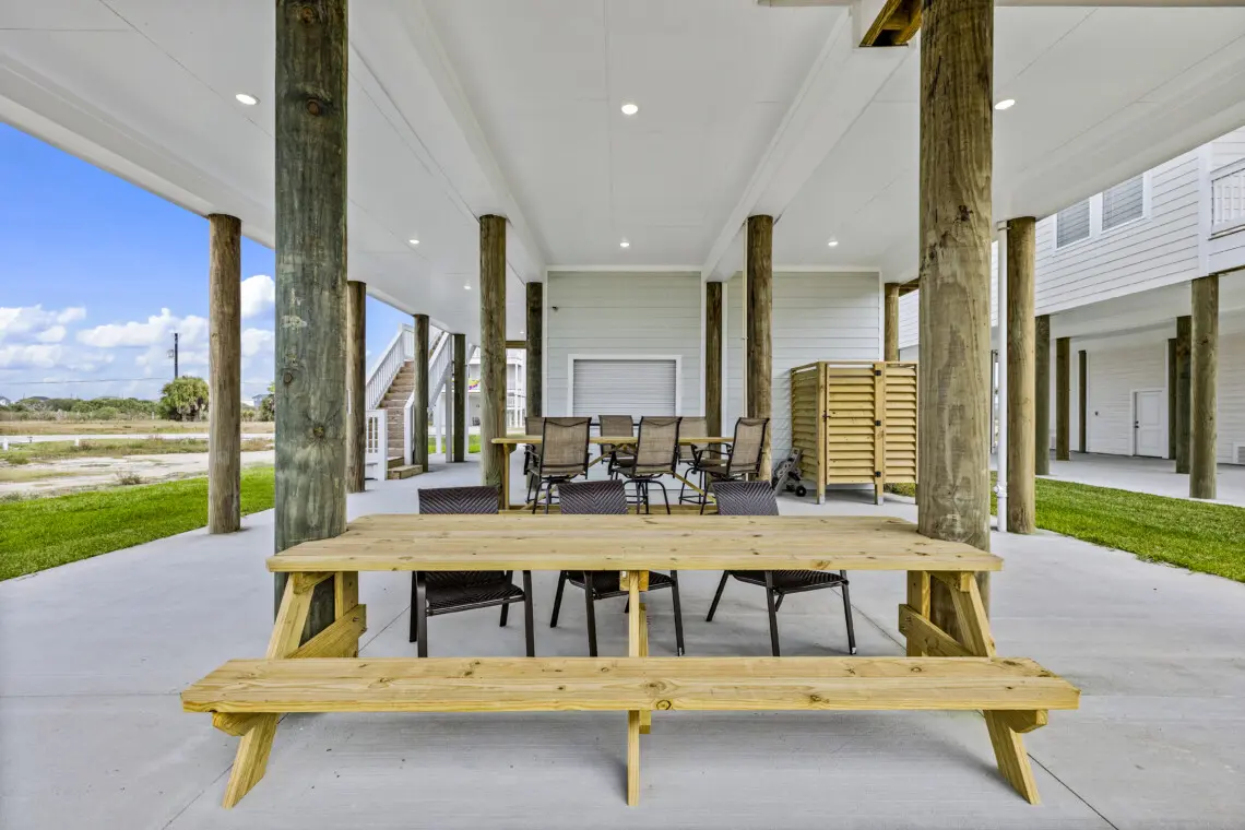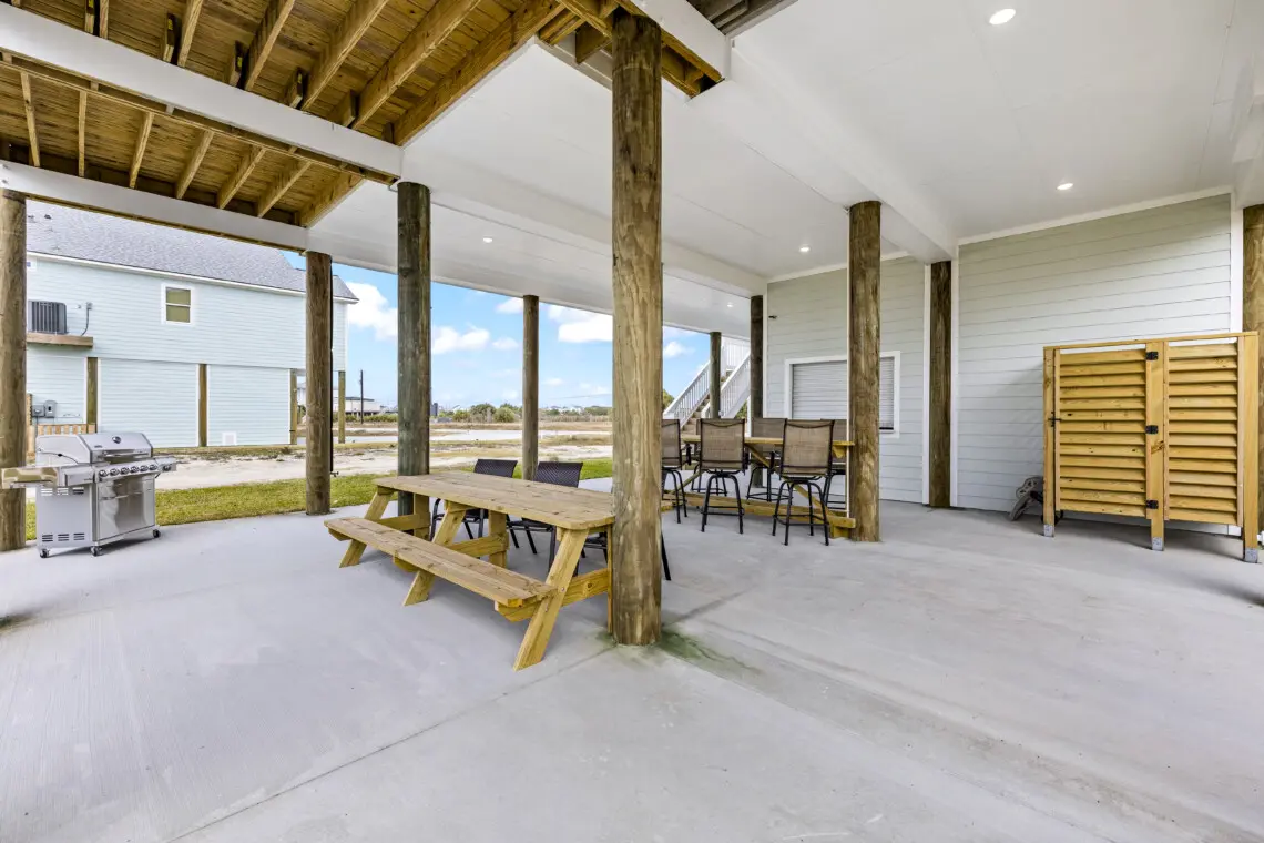 Enjoy plenty of patio space for gathering, with picnic benches for meals and games, plus a gas grill for cookouts. After the beach, rinse off in the outdoor shower, then head straight to the community pool and BBQ area right behind the home for an easy afternoon in the sun.