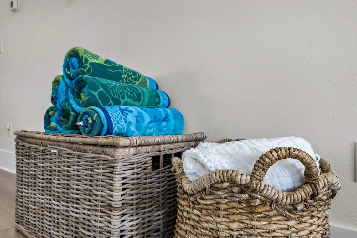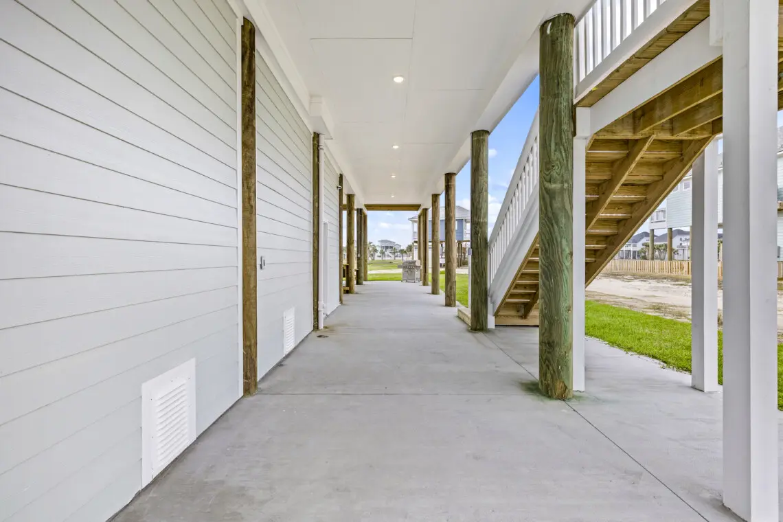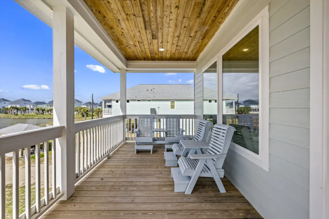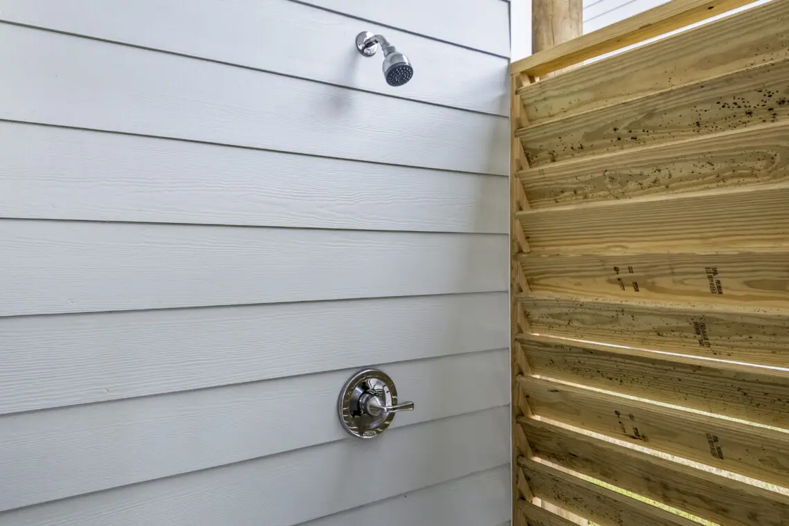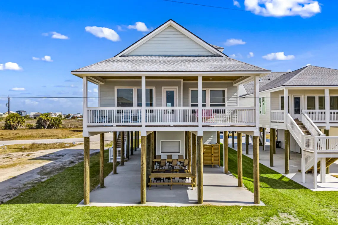 Enjoy plenty of patio space for gathering, with picnic benches for meals and games, plus a gas grill for cookouts. After the beach, rinse off in the outdoor shower, then head straight to the community pool and BBQ area right behind the home for an easy afternoon in the sun.