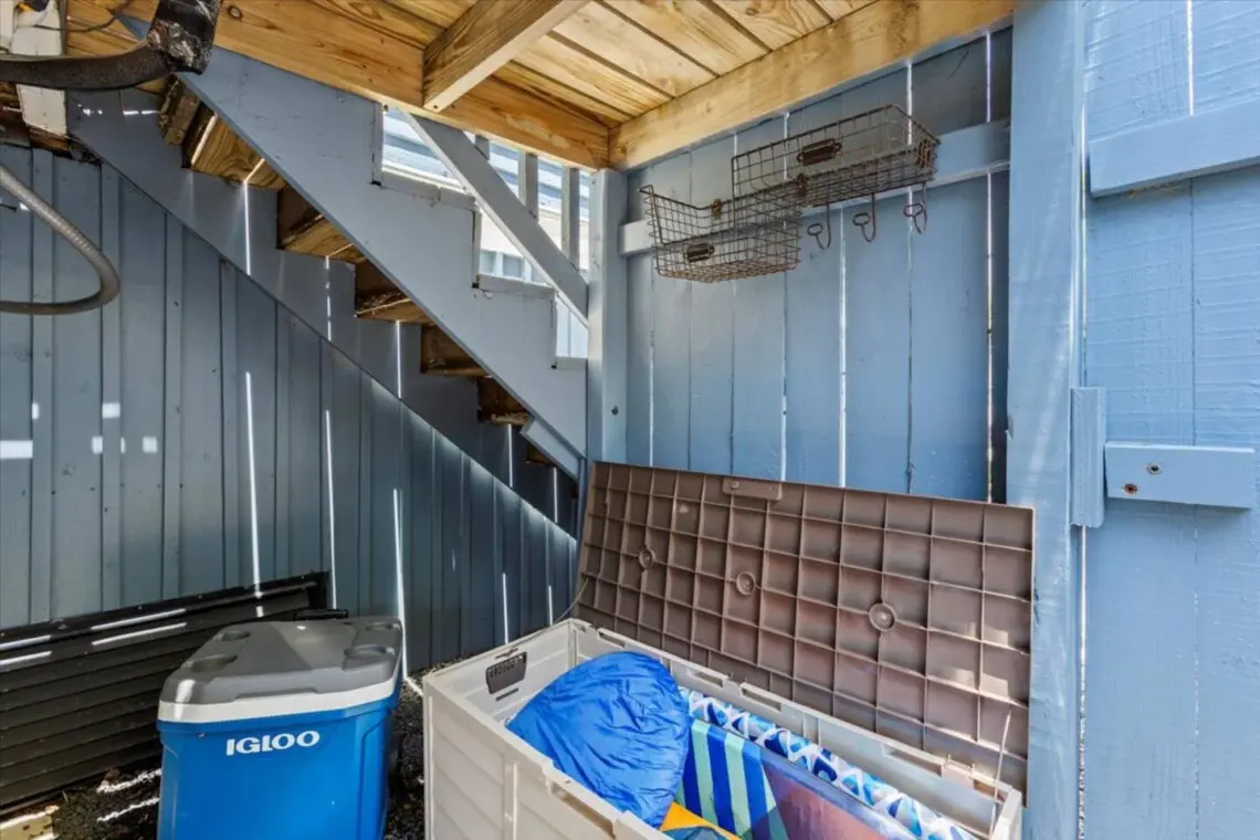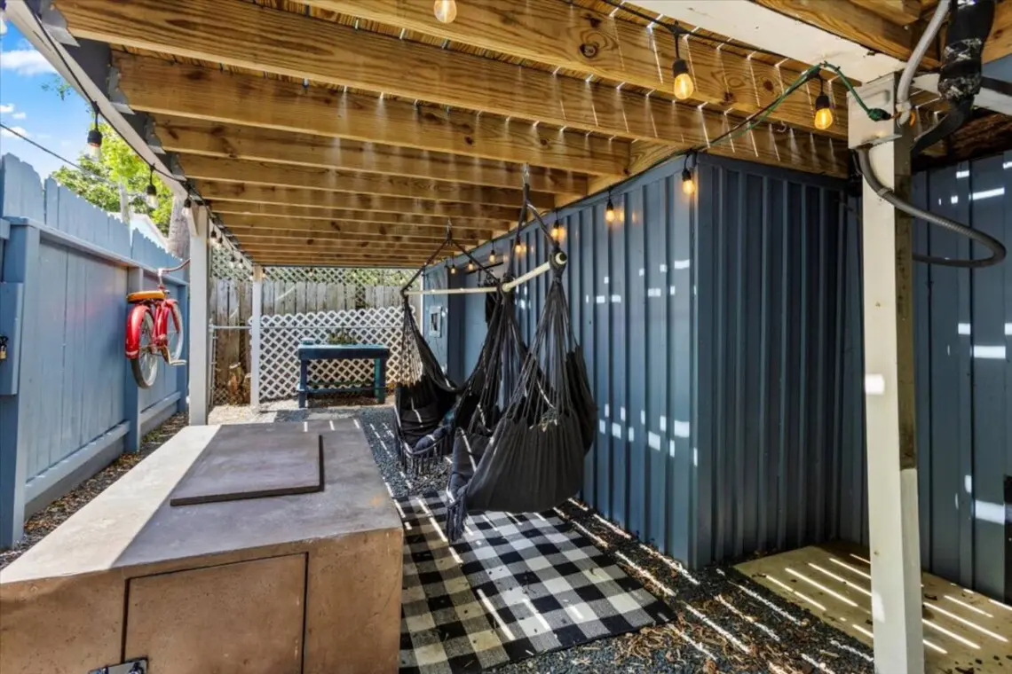 The private backyard is fully fenced, offering a breezy place to pause between outings. A deck with outdoor furniture invites you to settle in for an alfresco dinner or fire up the gas grill for a slow evening. The hammock provides a restful spot to sway in the shade, and the quiet setting makes it easy to unwind after a day at the shore. Parking is available with free street options and a small on-premises space that fits a compact SUV or golf cart.