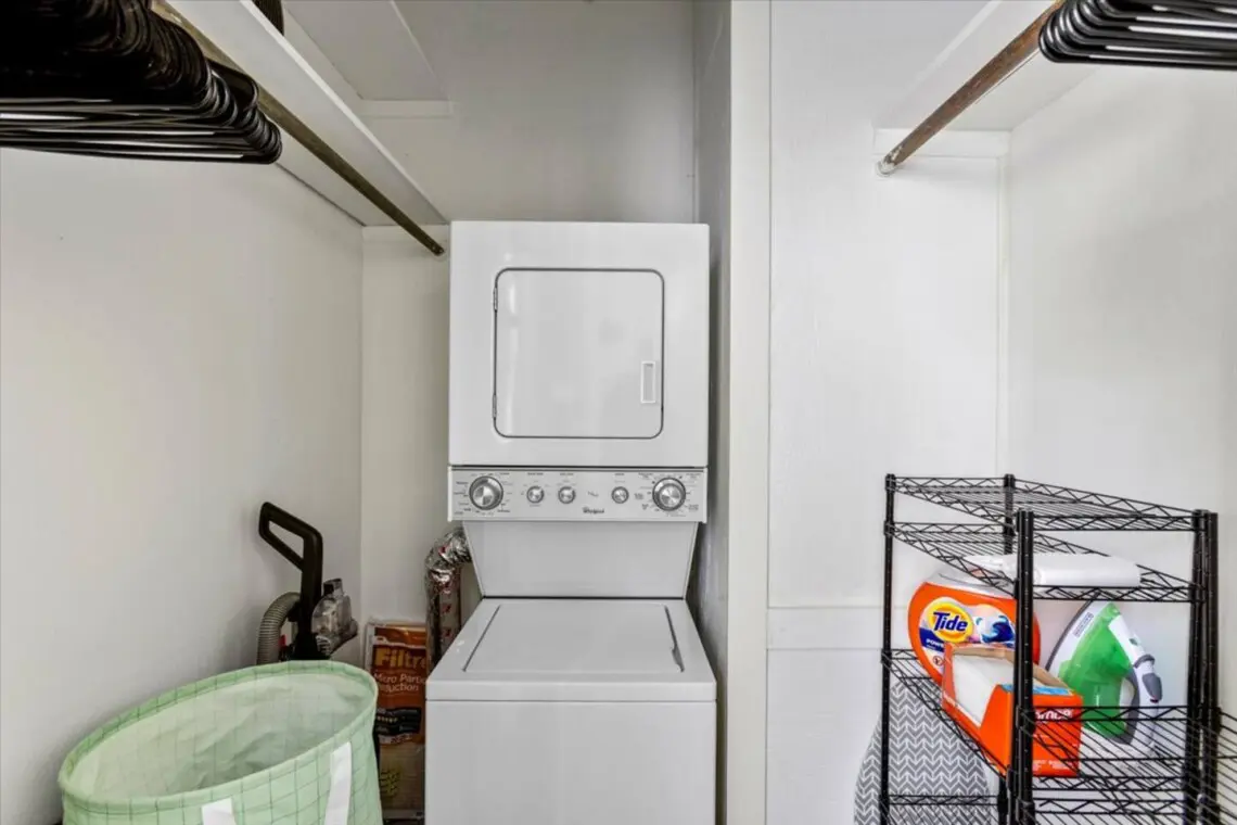 Two serene bedrooms accommodate up to four guests with two beds. Crisp cotton linens, room-darkening shades, and extra blankets ensure restful nights. Each room includes storage, and an in-unit washer and dryer add convenience for longer stays or beach-heavy days.