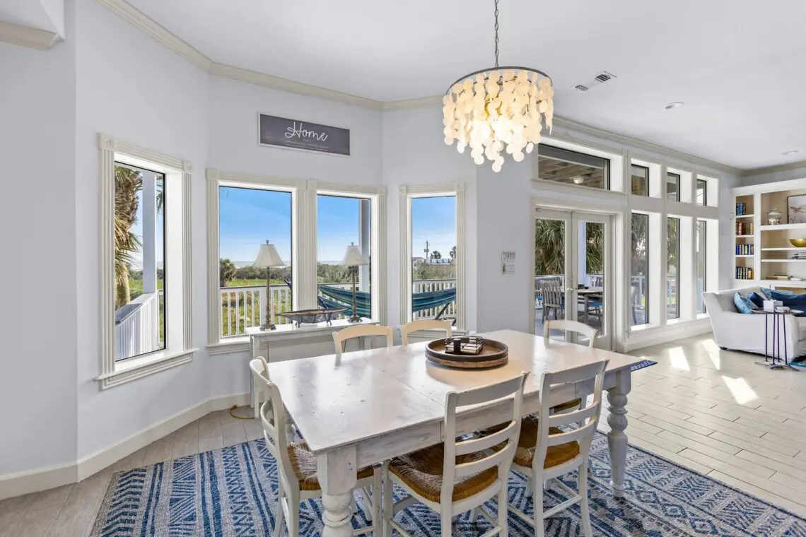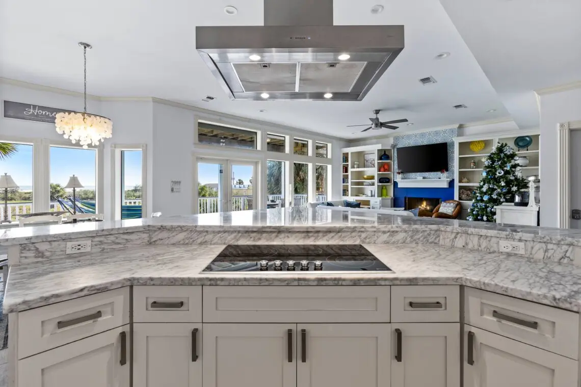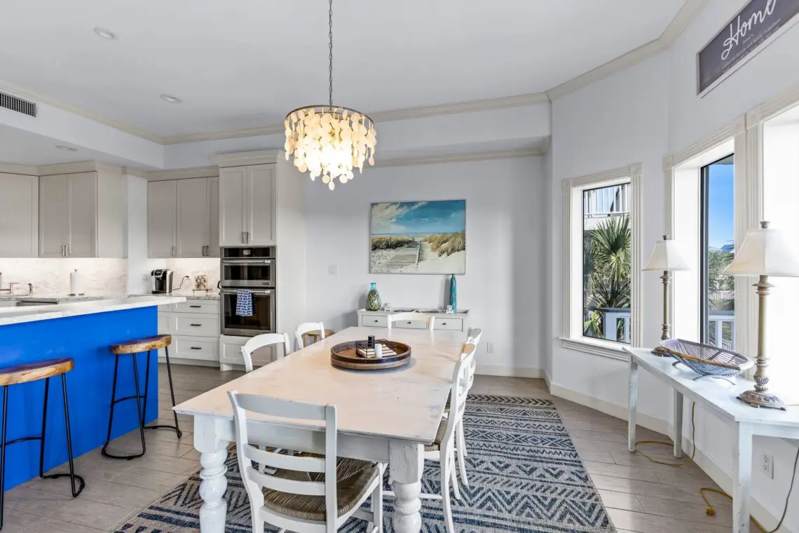 The first level features an open-concept kitchen, dining, and living room with a bright, airy feel and big windows overlooking the deck and ocean. The kitchen is large and stocked for cooking meals at home. The dining table seats 6, with additional seating for 6 at the kitchen island.