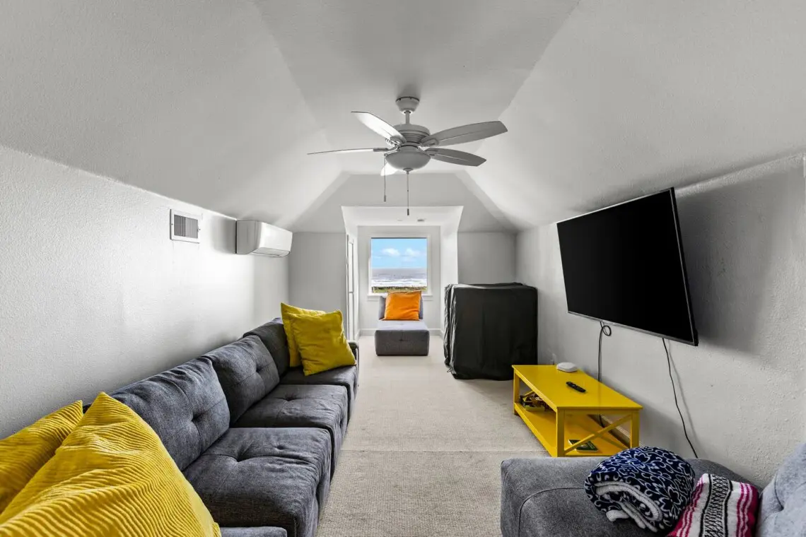 The third floor is a full-floor hangout space with lots of comfy seating, a TV with streaming services, and a cozy window nook with ocean views. The sofa pulls out into a bed for extra sleeping space.