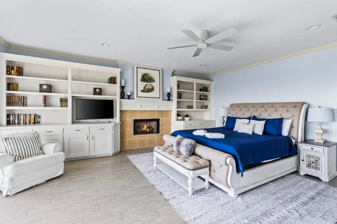 The living room includes two couches, a TV with streaming services, an electric fireplace, and books to enjoy.