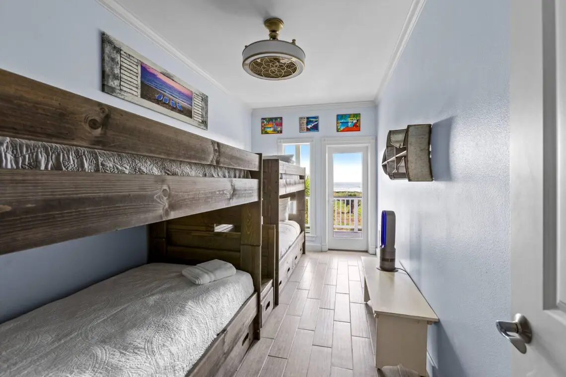 ● Bunk room: Two sets of twin bunk beds + deck access with seating