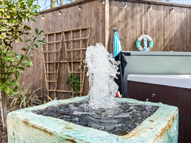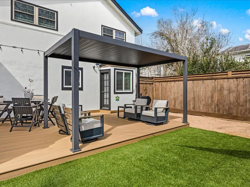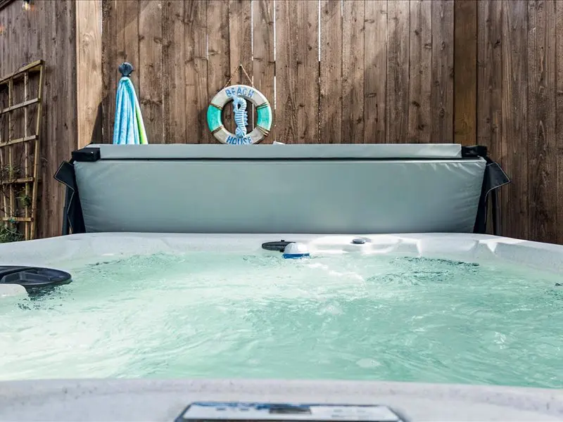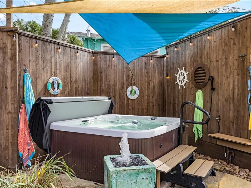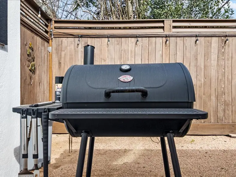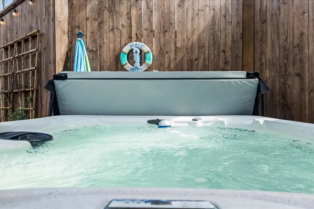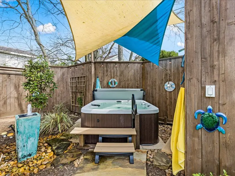 The backyard is set up for laid-back evenings with a hot tub, space to sit and eat outside, and a charcoal grill for cookouts.
