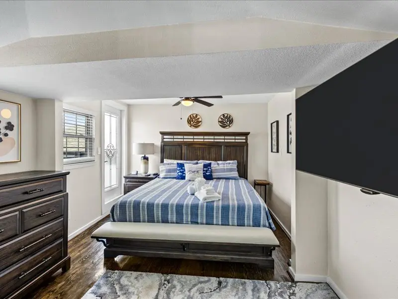 ● Primary bedroom: King bed + TV with streaming + ensuite bathroom (shower) + private balcony with seating overlooking the front of the home