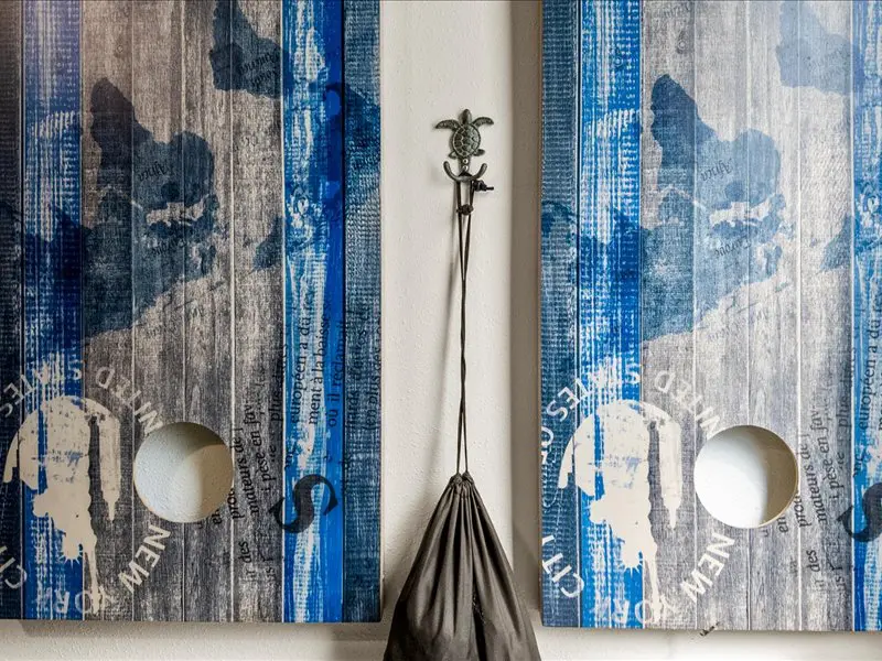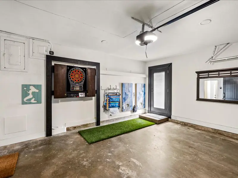 There’s an entry through the garage to the backyard, and the garage includes a dartboard and cornhole for extra fun between outings.
