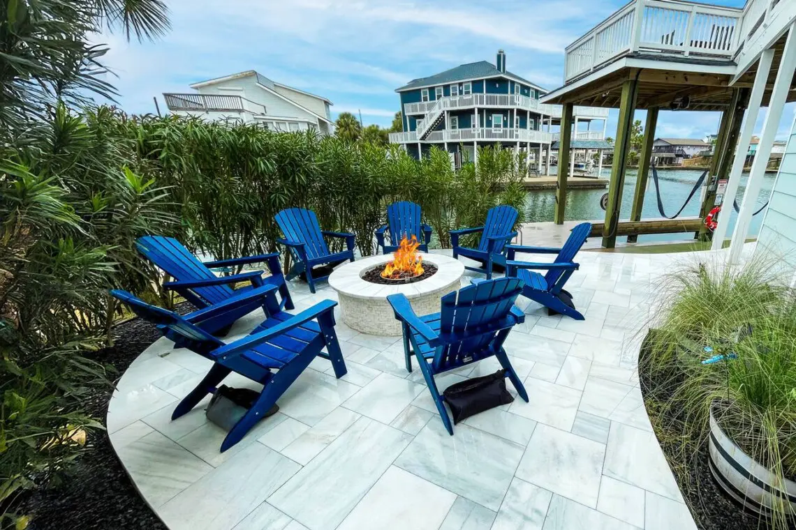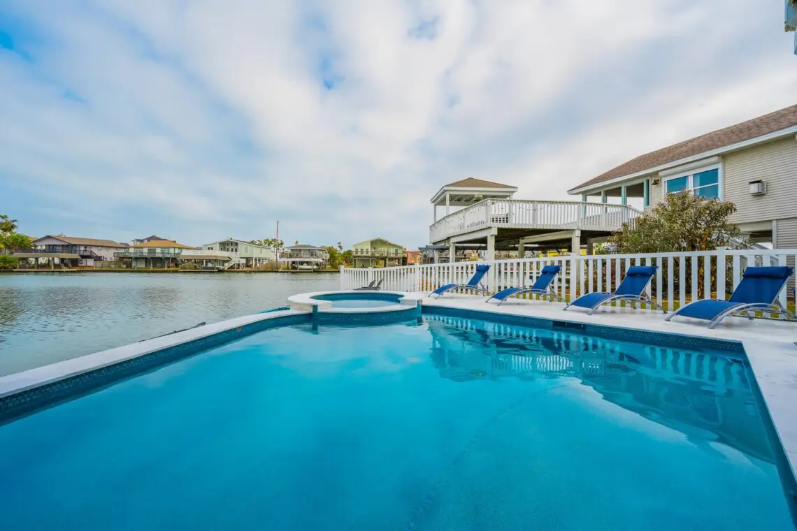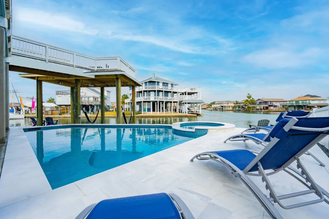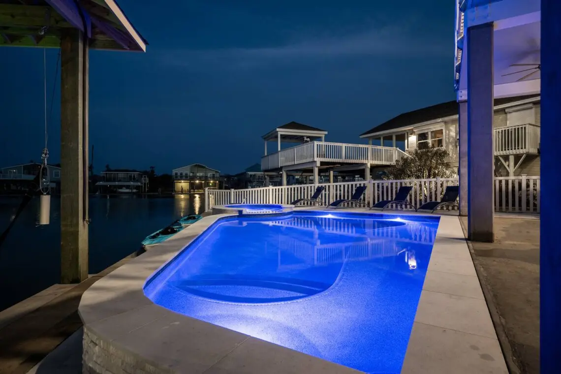 Escape to Pelican Lookout, a breathtaking beach house with panoramic canal views. Enjoy a private pool, heated for cooler days, and a waterside spa for boat watching. Relax at the poolside bar or by the gas firepit. Book now for unforgettable memories! Plus, get 25% off Beachin’ Rides Golf Rental with your stay!