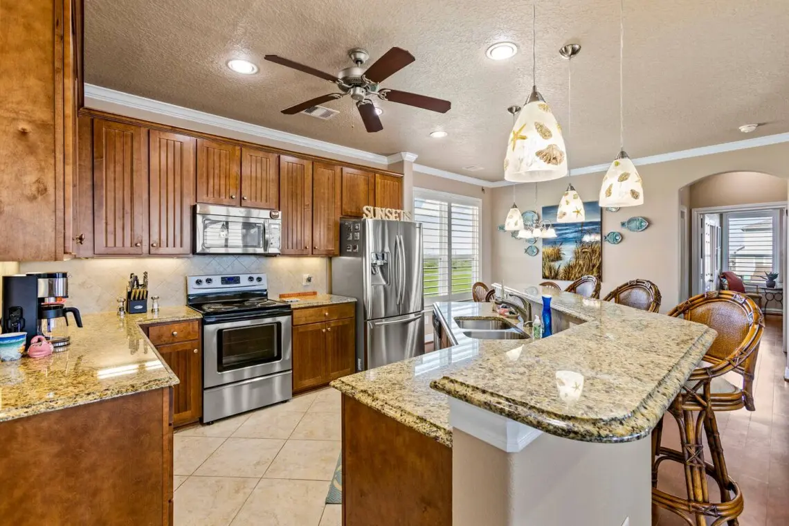 Welcome to Seas The Moment, located steps from the tranquil beaches of the Gulf of Mexico. This home features spectacular ocean views and easy beach access. The outdoor area includes a full kitchen and BBQ on a spacious patio, ideal for entertaining. Indoors, comfort awaits with two king beds, an extra sofa bed, and convenient laundry amenities. Ideal for picturesque escapes or joyous family gatherings, this property offers a memorable experience in a picturesque setting.