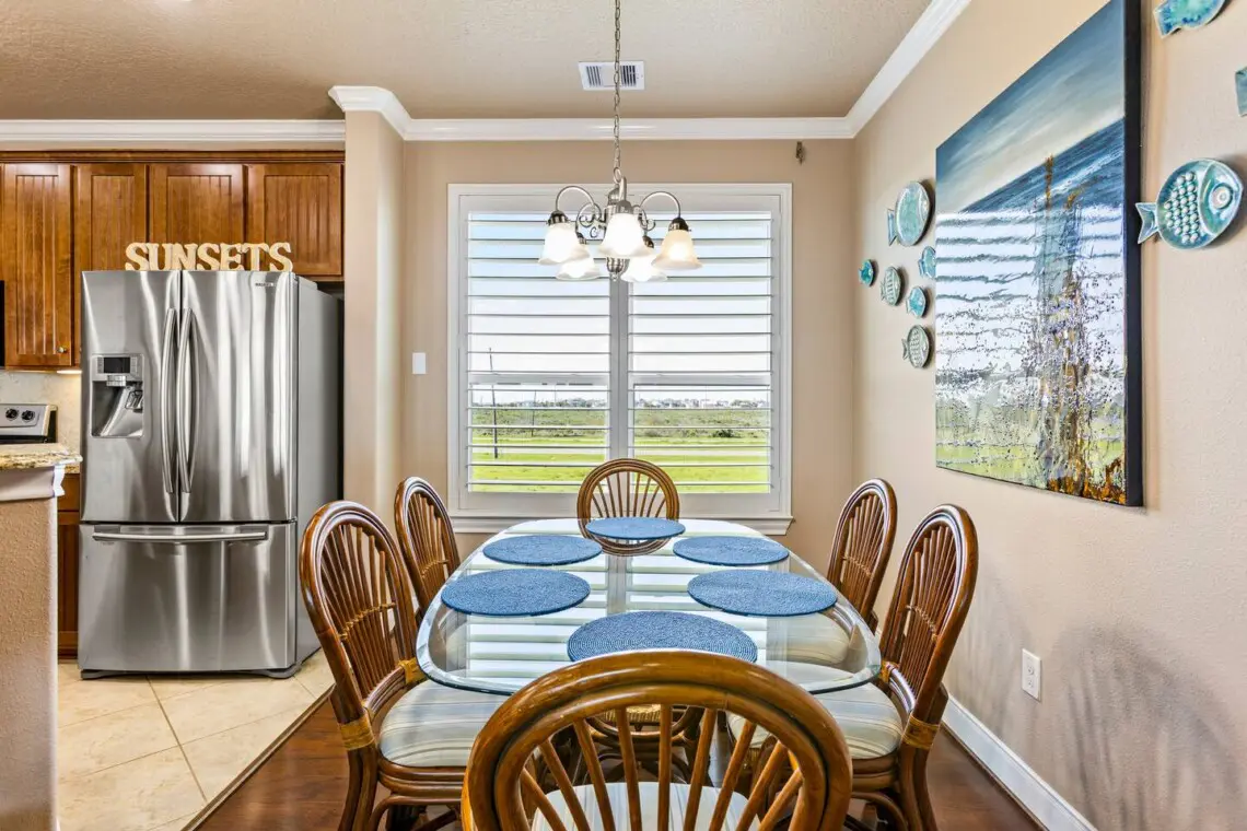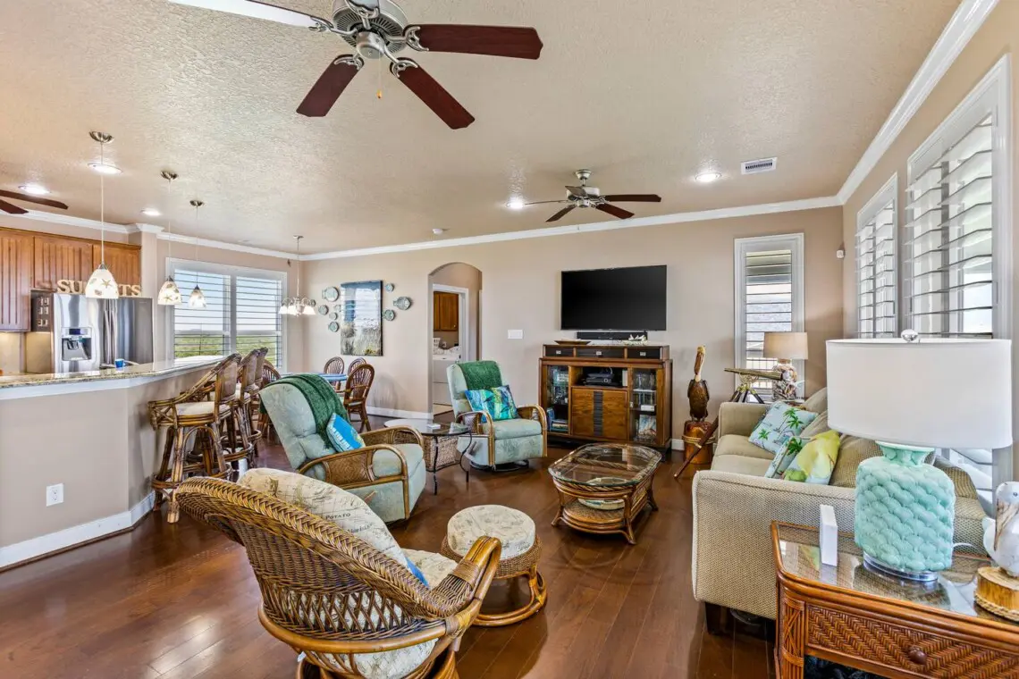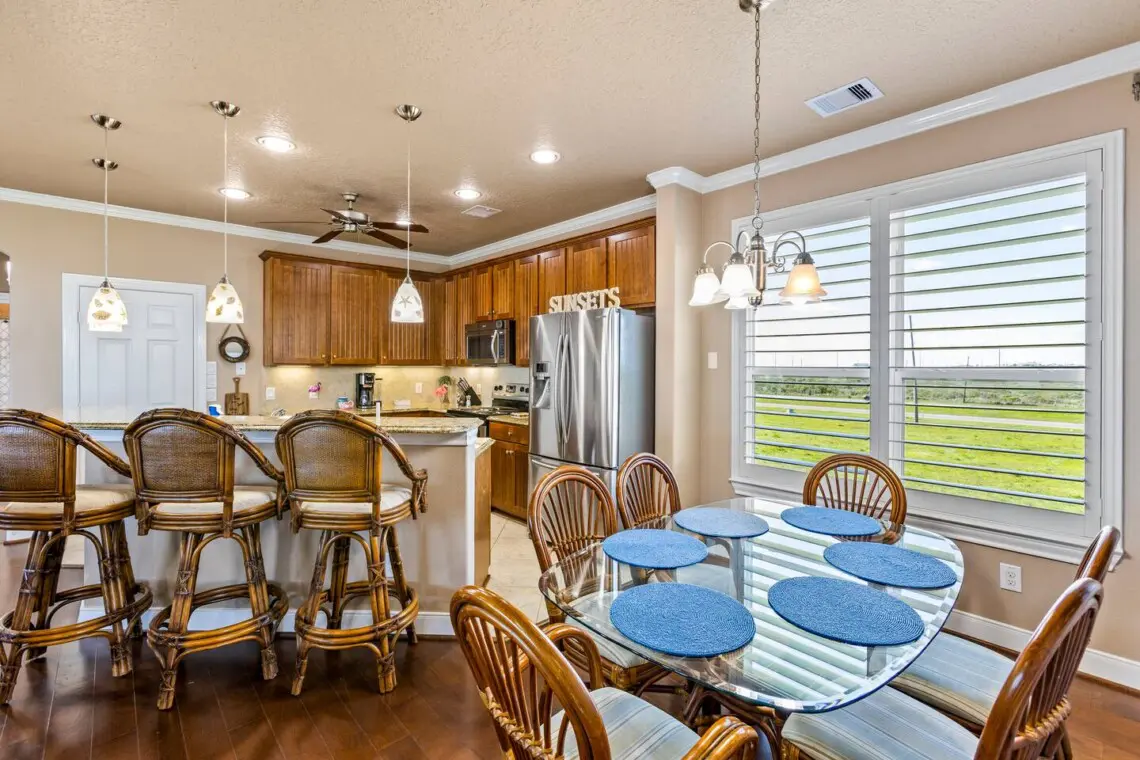 Welcome to your home-away-from-home where comfort meets elegance in our expansive, open-concept living area. Perfect for families and friends, this inviting space encourages you to unwind with plush seating and a serene decor that reflects the tranquility of the coast. Whether you’re here to play games, share meals at the spacious dining area, or simply relax and watch a movie, every moment promises to be memorable. The natural light streaming through large windows enhances the warm, welcoming atmosphere, making it an ideal gathering space for creating lasting memories.