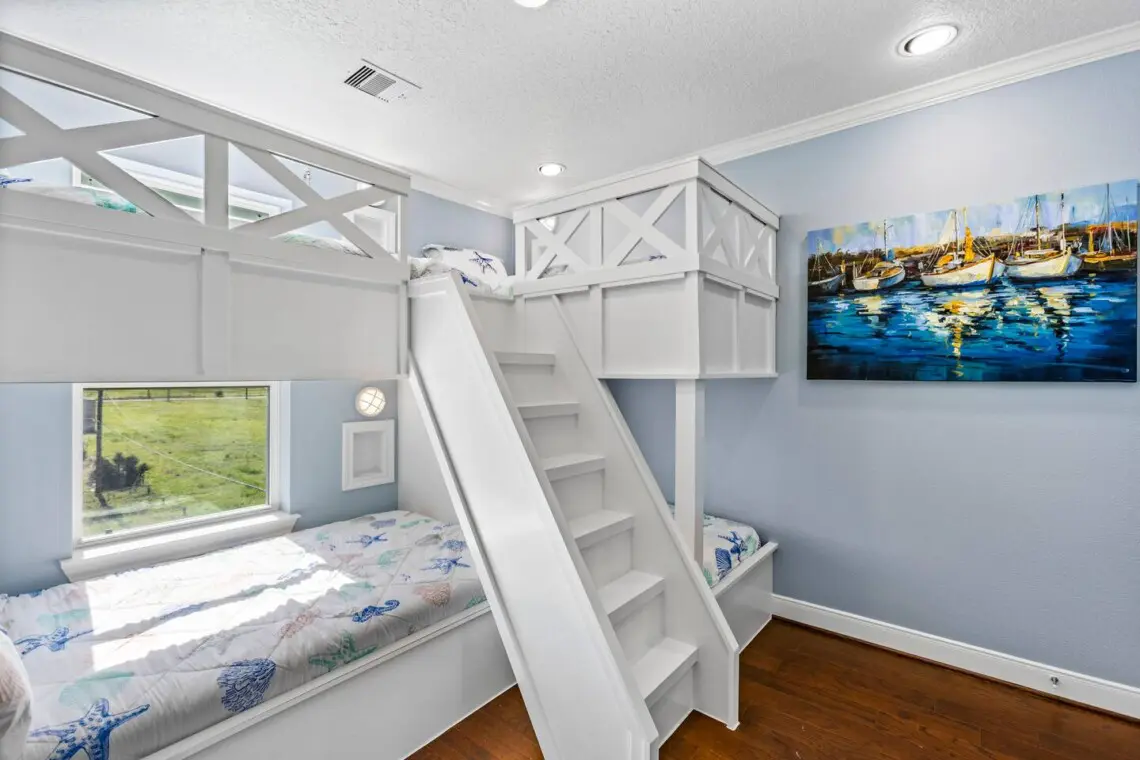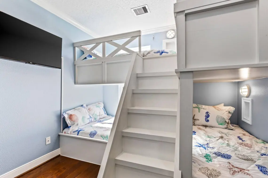 Bedroom #3 is perfect for kids or additional guests, featuring a fun and functional bunk space with three single beds and one double bed.